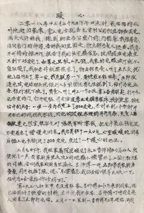 “元旦放假前夕,家里只剩下25度電,我急忙去物業(yè)售電室買電,但售電人員在銀行辦事,此刻又臨近下班,物業(yè)負責人聽聞此情況立即拿上備用鑰匙,打開水電辦公室的門,打開電腦,按水電銷售程序,一步一步為我充上了300度電,買電的過程不到二十分鐘,井井有條,毫無怨言。物業(yè)負責人還叮囑我說拿好零錢,把電卡裝在錢包里,不要著急慢慢走回家,我總算松了一大口氣,心里暖暖的,就這樣度過了一個暖心的元旦節(jié)日。