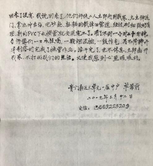 近日,棗園小區(qū)(青門新區(qū))住戶單先生向中心物業(yè)管理服務事業(yè)部送來一封感謝信,向城北服務區(qū)的物業(yè)服務人員及維修師傅們表示衷心的感謝。