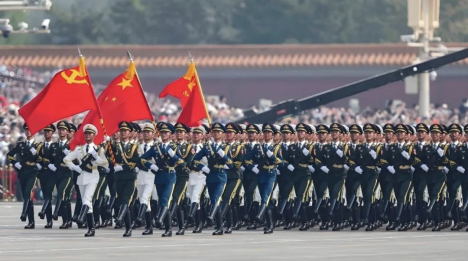 閱兵式上,空中梯隊組成“80”字樣,昭示偉大抗戰(zhàn)精神永恒不朽??罩凶o旗方隊、徒步方隊、裝備方隊、戰(zhàn)旗方隊、空中梯隊等威武雄壯。腳步鏗鏘,英姿颯爽,鐵流滾滾,銳不可當(dāng)。各種新式兵種及軍隊裝備,充分展示了我軍在新形勢下強大的軍事防御及戰(zhàn)斗力,